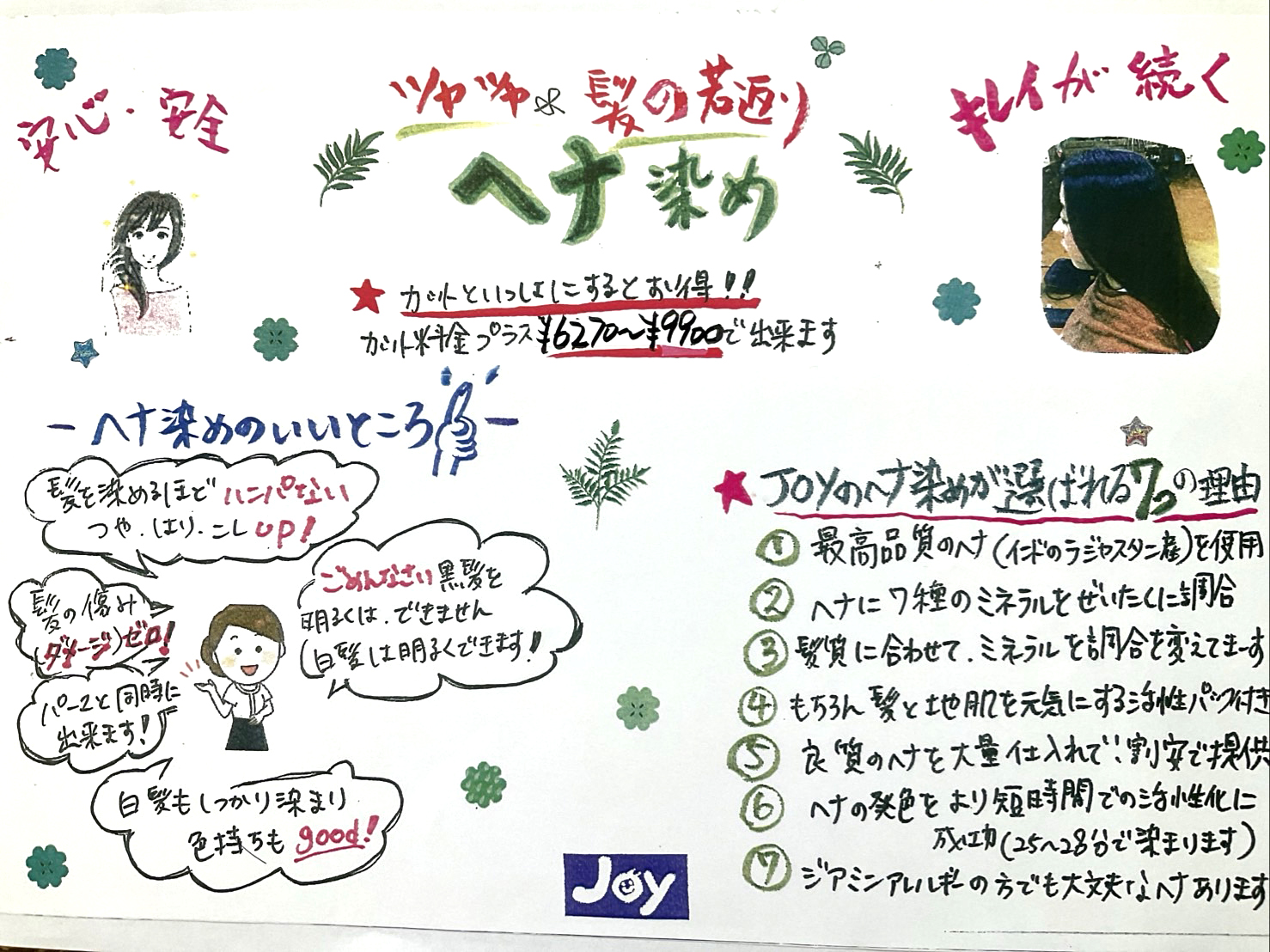 ダメージゼロのヘナカラー!Joyのヘナは、インドのラジャスタン地方の高品質ヘナを使用されていただいています。ヘナは7種のミネラルを髪質に合わせてブレンドしており、髪の毛のツヤ・ハリ・コシがUPします。